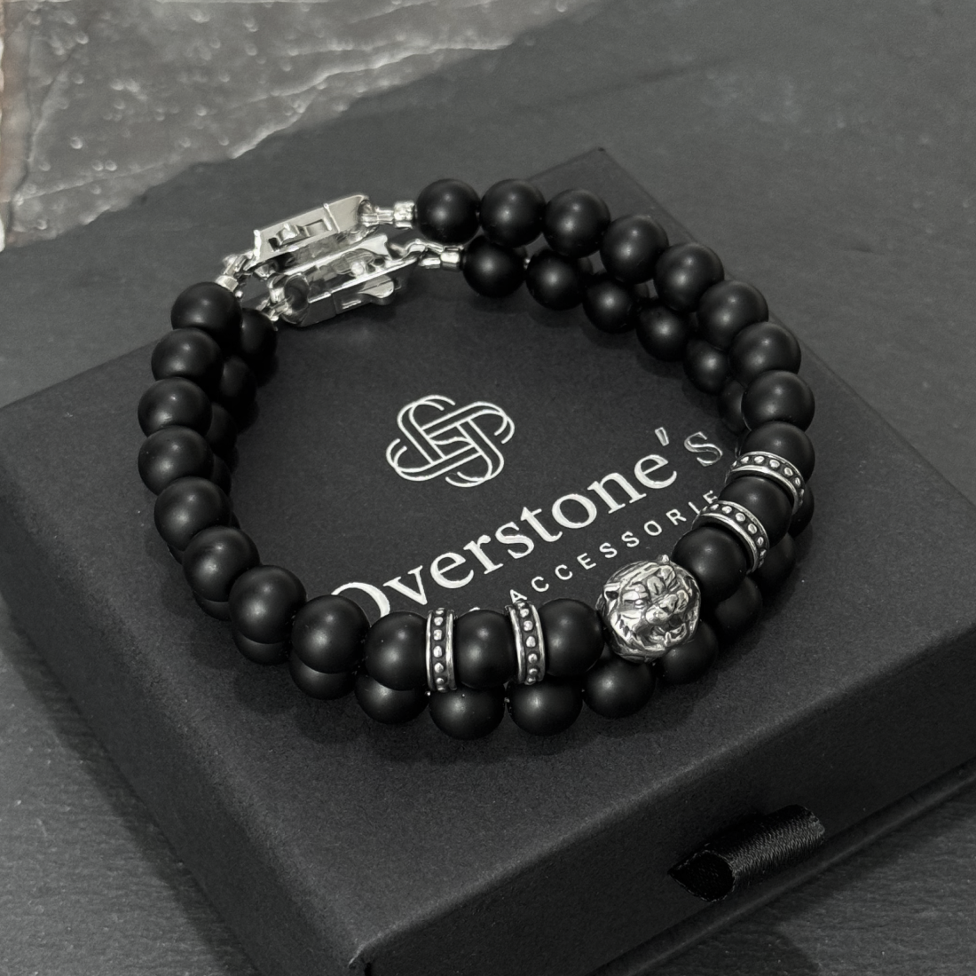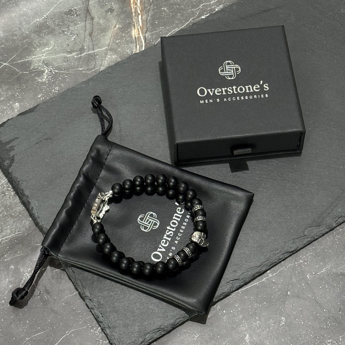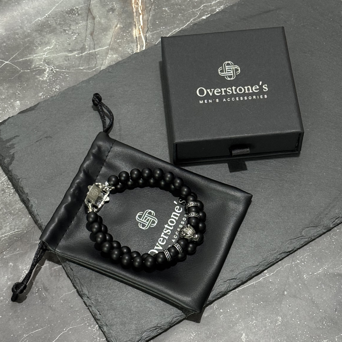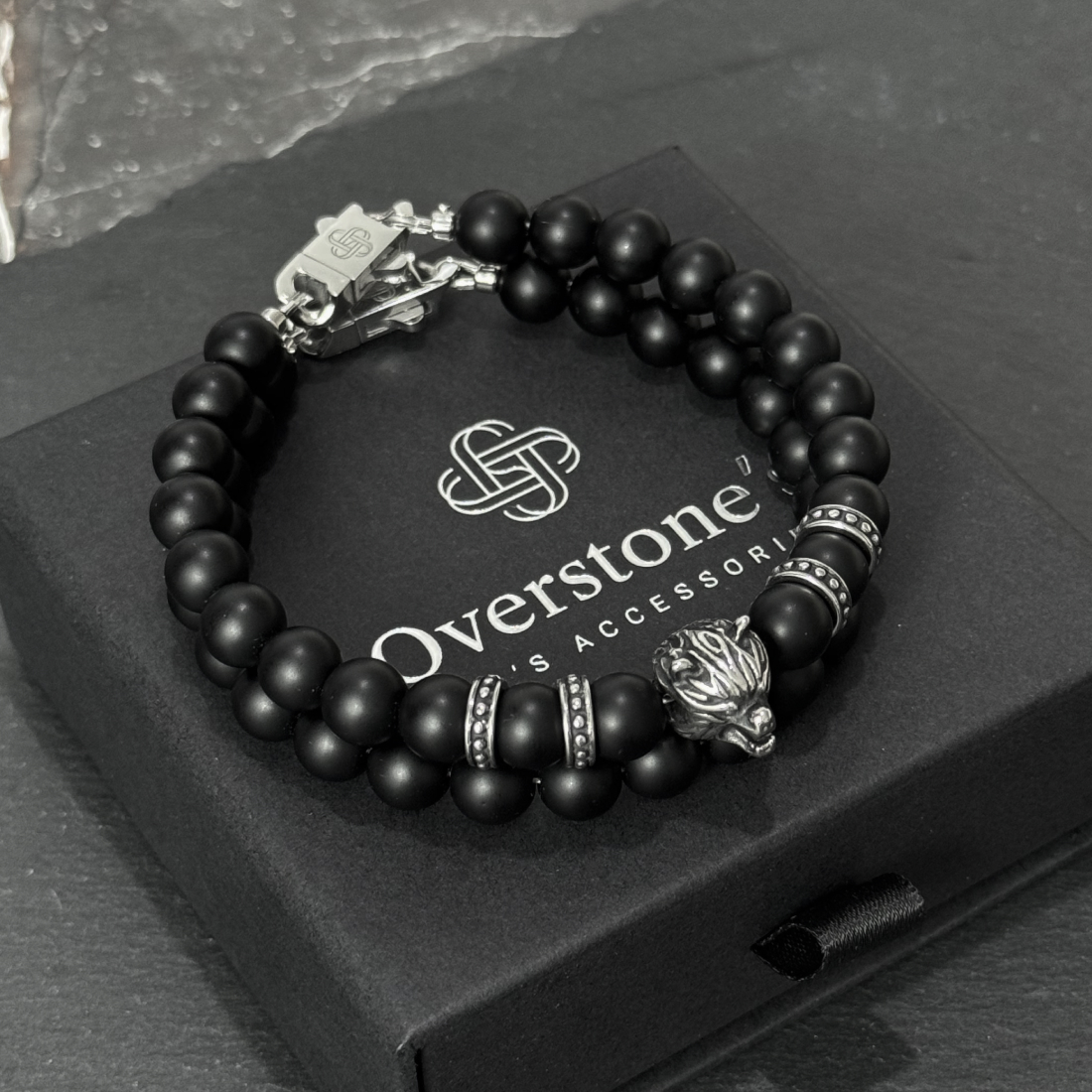 Двойной браслет из матового чёрного агата с металлическим акцентом. Основа — прочный стальной трос, сохраняющий форму и не подверженный растяжению. Фурнитура и замок выполнены из нержавеющей стали с гравировкой Overstone’s. В комплекте — фирменная коробка и мешочек из эко-кожи.