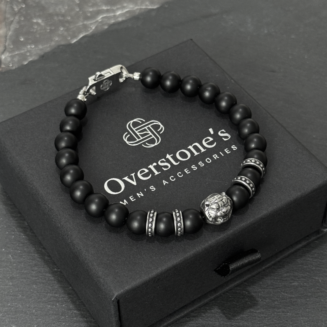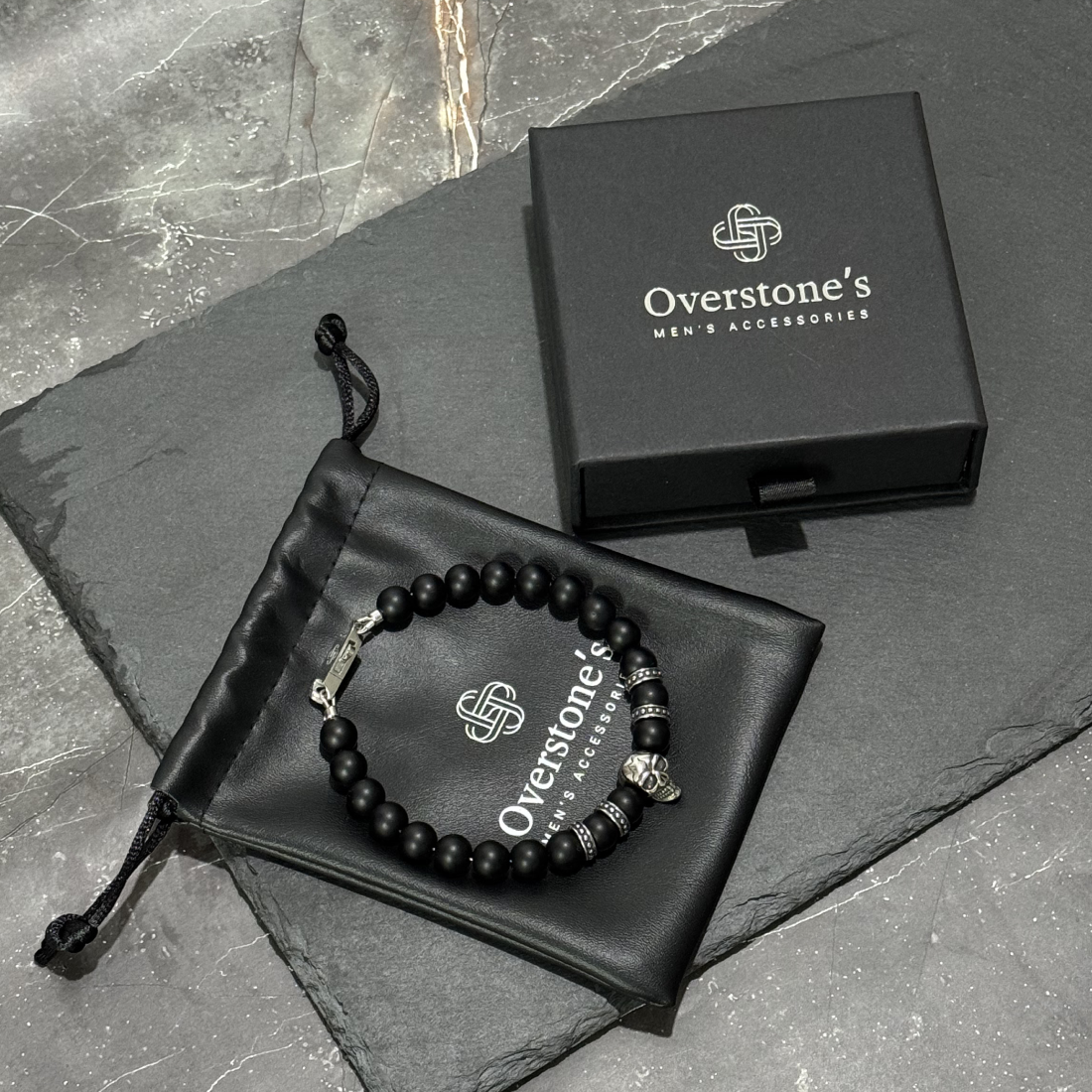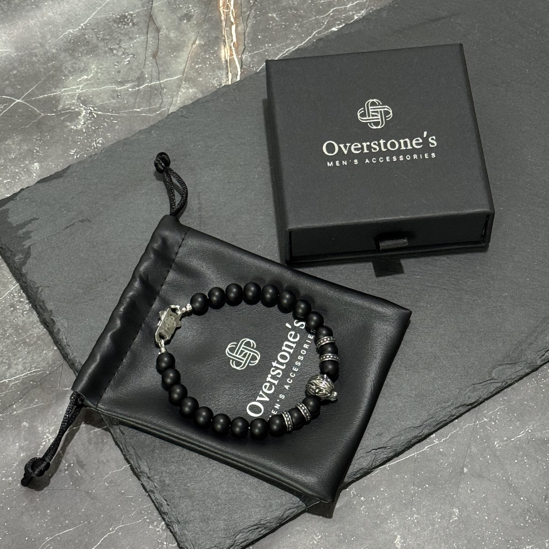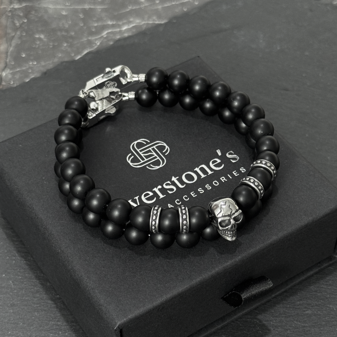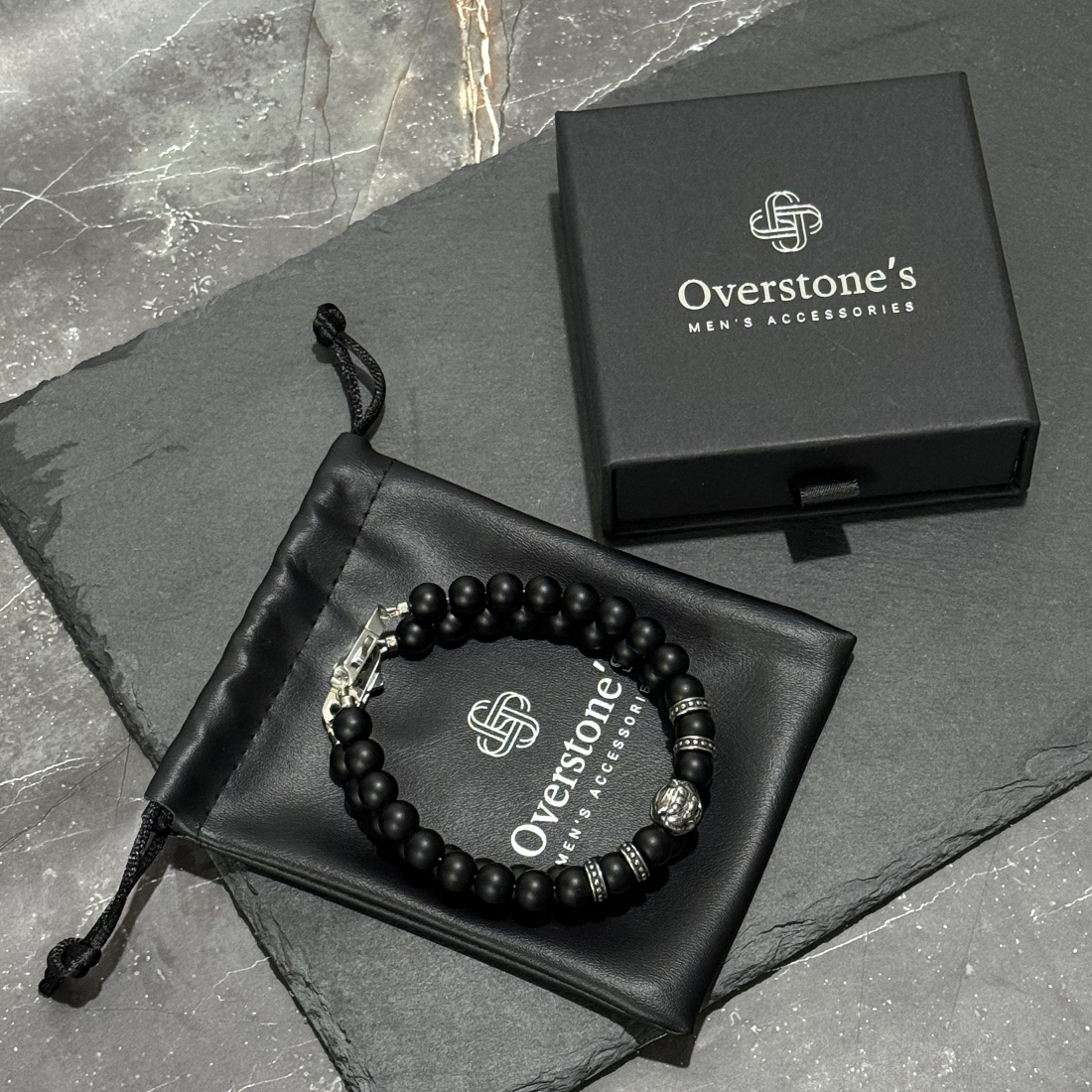 Двойной браслет из матового чёрного агата с металлическим акцентом. Основа — прочный стальной трос, сохраняющий форму и не подверженный растяжению. Фурнитура и замок выполнены из нержавеющей стали с гравировкой Overstone’s. В комплекте — фирменная коробка и мешочек из эко-кожи.