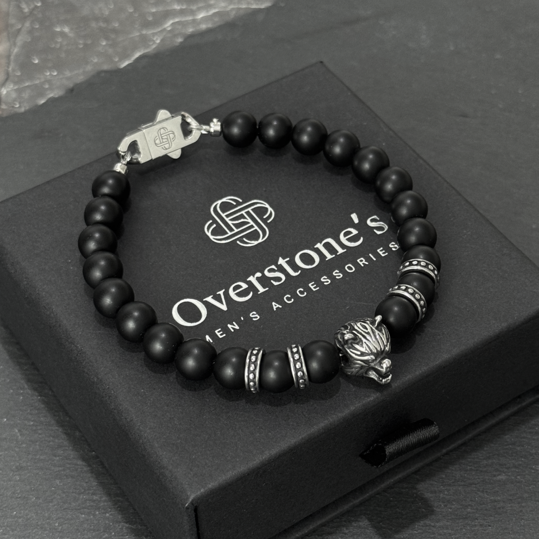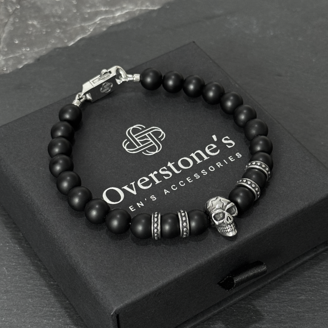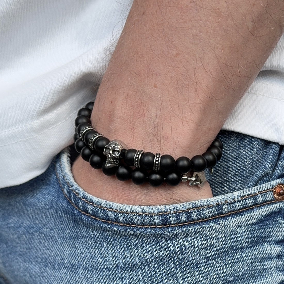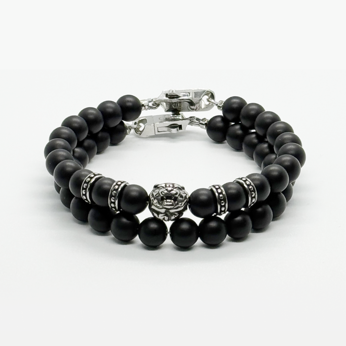 Двойной браслет из матового чёрного агата с металлическим акцентом. Основа — прочный стальной трос, сохраняющий форму и не подверженный растяжению. Фурнитура и замок выполнены из нержавеющей стали с гравировкой Overstone’s. В комплекте — фирменная коробка и мешочек из эко-кожи.