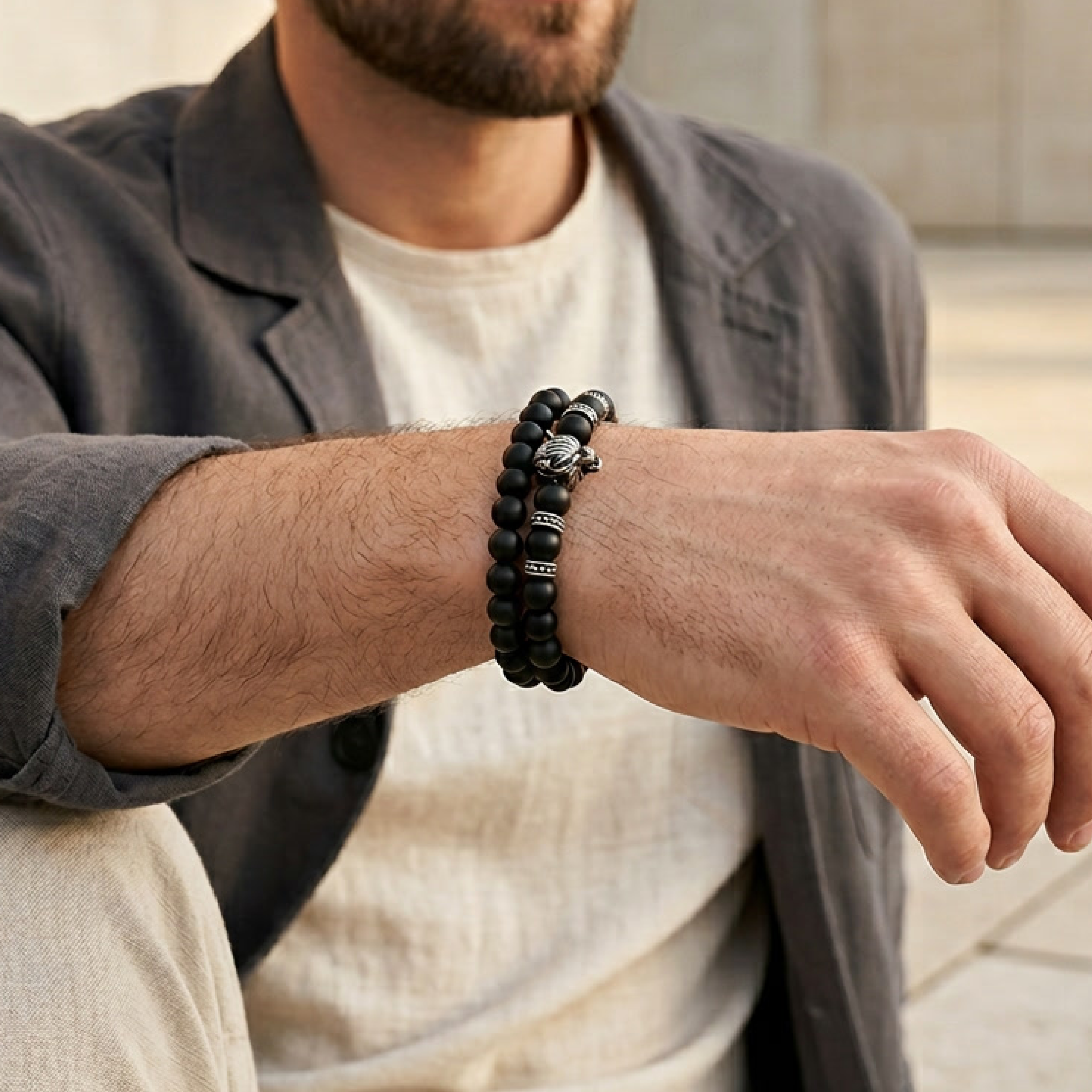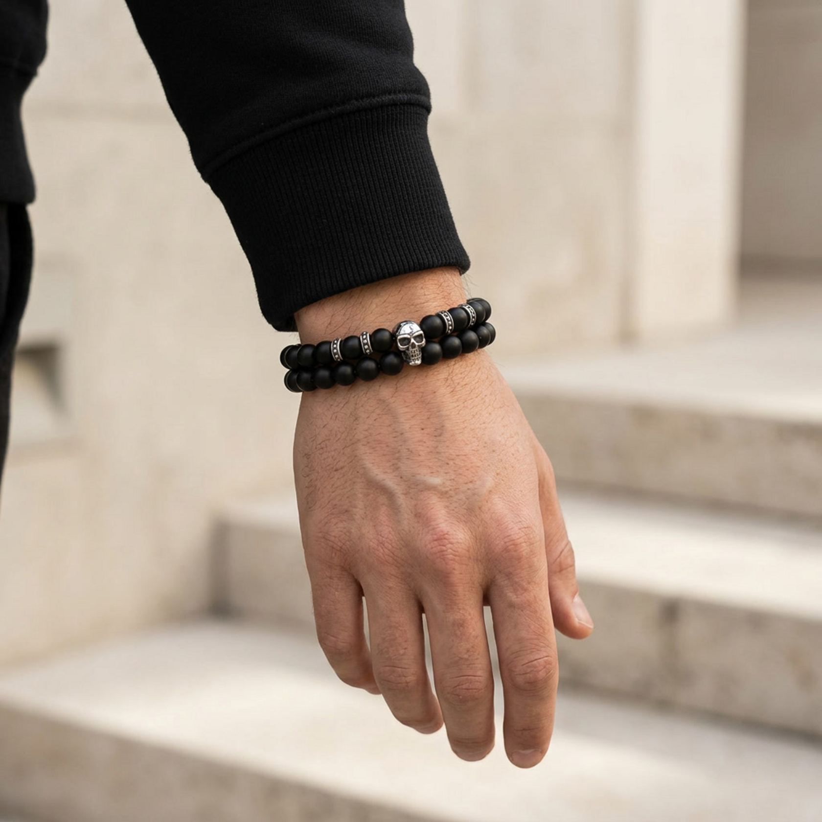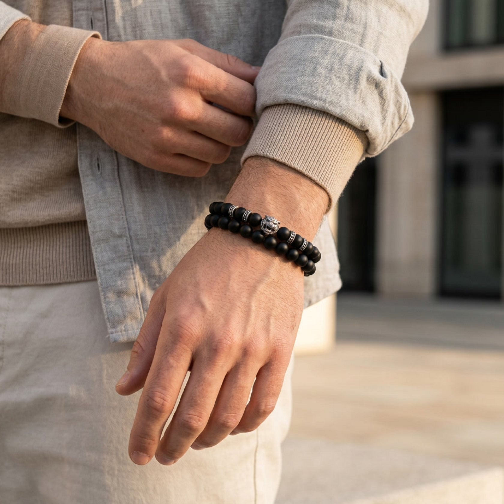 Двойной браслет из матового чёрного агата с металлическим акцентом. Основа — прочный стальной трос, сохраняющий форму и не подверженный растяжению. Фурнитура и замок выполнены из нержавеющей стали с гравировкой Overstone’s. В комплекте фирменная коробка и мешочек из эко-кожи.
