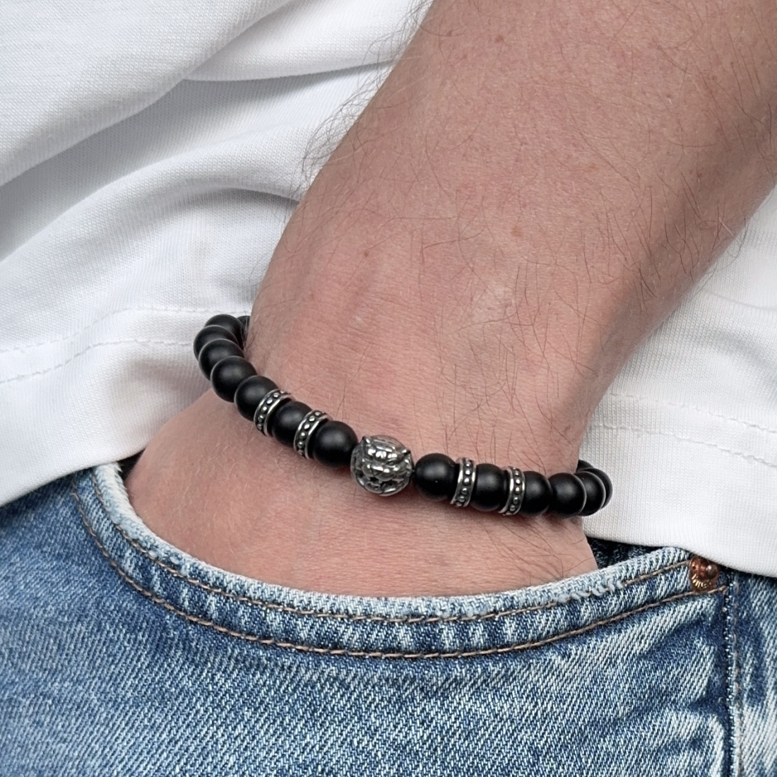 Одинарный браслет из чёрного матового агата с металлическим элементом. Основа — прочный стальной трос, сохраняющий форму и не подверженный растяжению. Фурнитура и замок выполнены из нержавеющей стали с гравировкой Overstone’s. В комплекте — фирменная коробка и мешочек из эко-кожи.